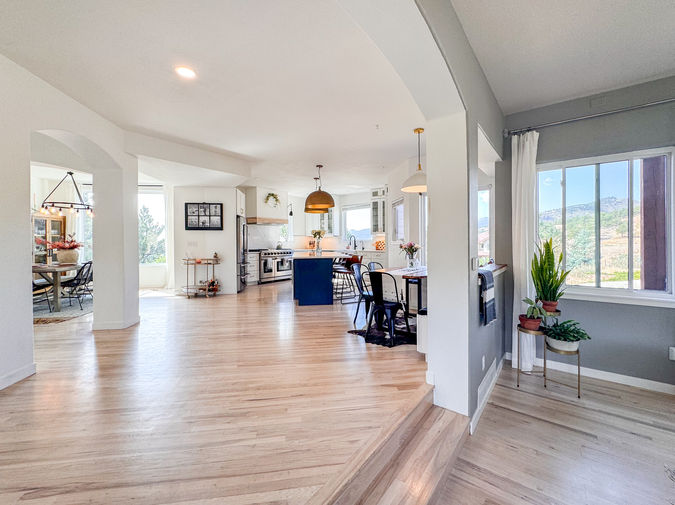 We sanded existing hickory hardwoods with a slight Norweigan white tint, and added new matching hardwoods to the remaining spaces of the main floor to create continuity. We repainted the interior a clean white to pave the way for art and windows being the colorful accents of the design. We refurnished every space of the main floor with the modern west aesthetic in mind.